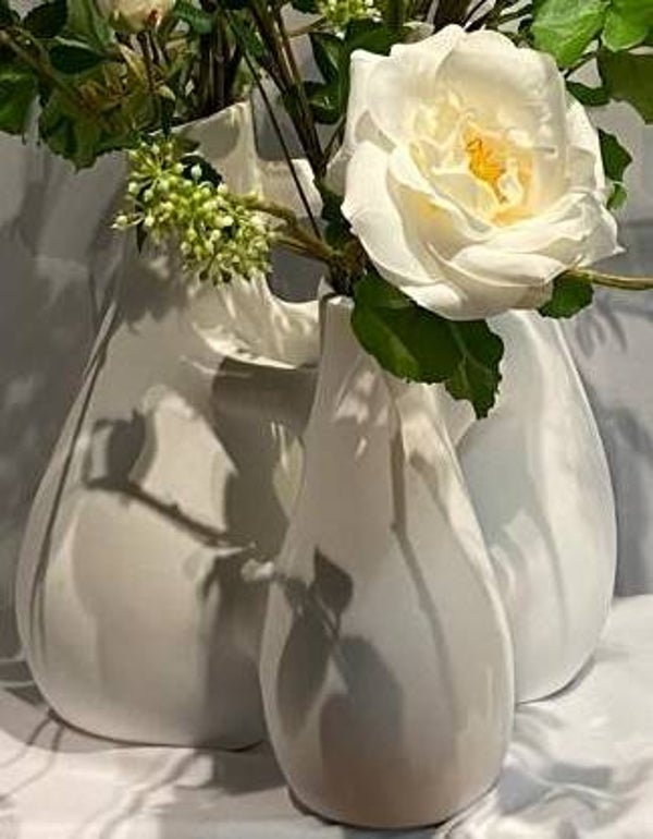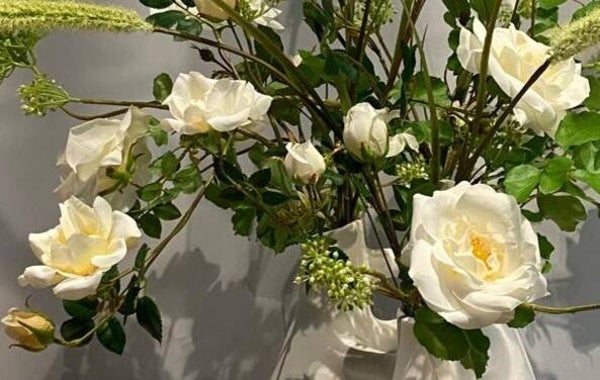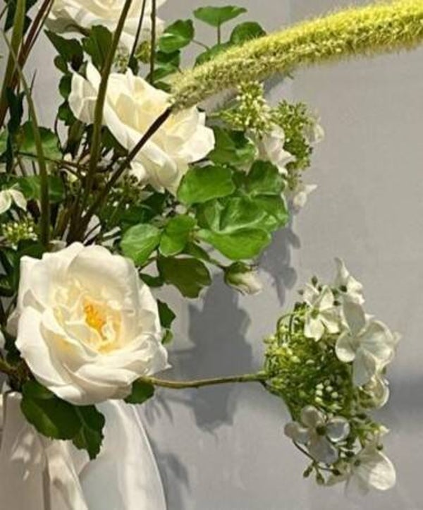 Vossenstaart en hortensia´s met crèmekleurige rozen die hun zonnig hart tonen tussen de jonge selderijbladen. Dit stuk oogt als sneeuw in de zon.