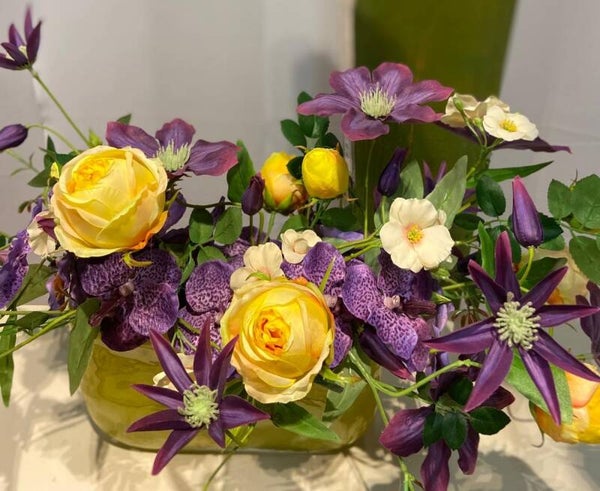 Een speelse creaties van rozen, orchideeën..... en zoveel meer, passend in een organisch gevormde glazen vaas.
