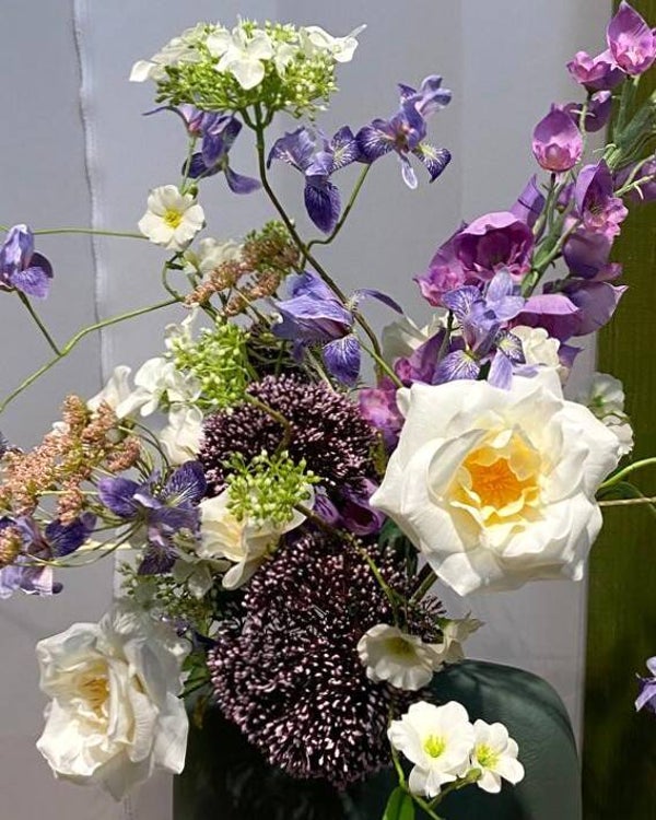 Acht verschillende bloemen naast elkaar maken dat de monnikskap zich in de hoogte uitstrekt om zijn volle pracht te tonen. Alles sierlijk samengebracht in een olijfgroene vaas : H27 x B13
