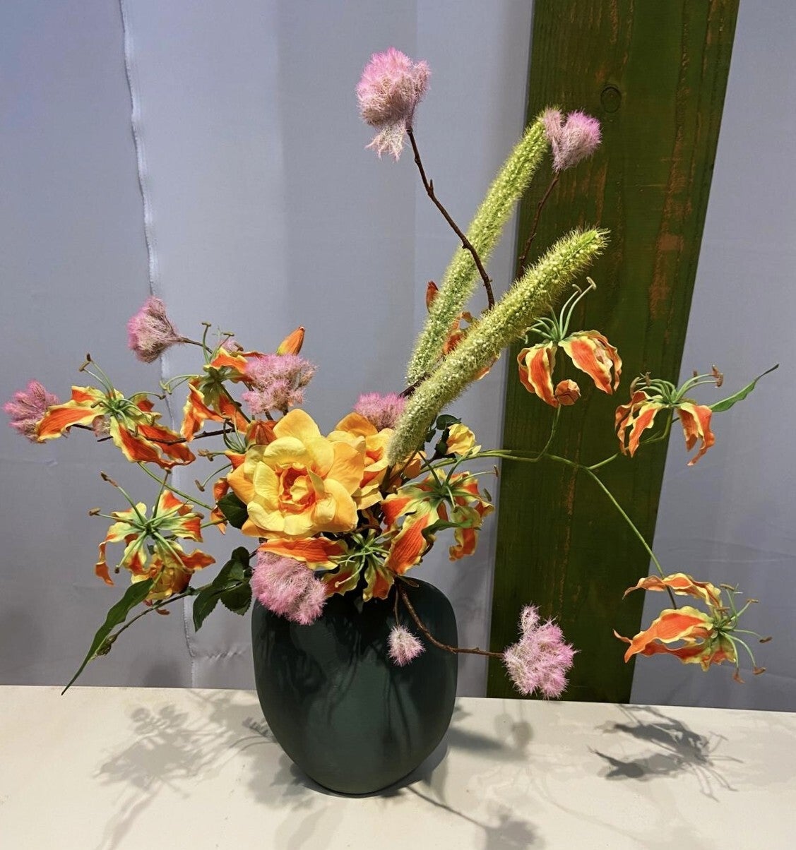 Samen ontspruiten ze uit een olijfgroen vaasje : H25 X B12 De hoogste bloeier rijkt tot 64cm. (vaas inbegrepen)