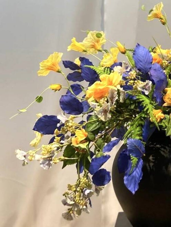 Wilde hortensia, vossenstaart, roos, ochtend glory en de grote wilde aspergusbladeren, samen gebracht tot een puur geheel. De kleuren spreken voor zich. Een enig stuk, je blijft genieten van deze wilde & pure creatie.